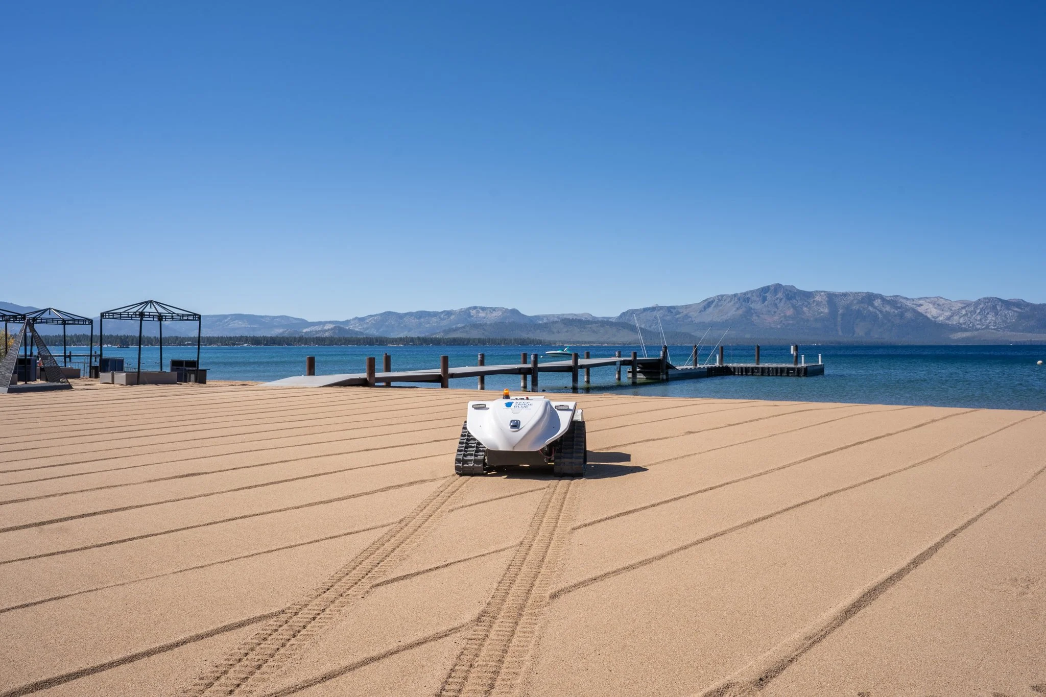 Image: BEBOT on the job at Tahoe Beach, leaving behind a perfectly clean shoreline. September 2025. Photo by: Katy Jo Caringer